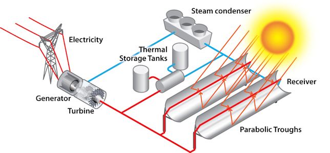 All thermal power plants, including CSP Plants, require some standard power plant equipment to function. A steam boiler and a condenser boiler to turn water into high pressured steam, a steam turbine to turn an electrical generator, creating the electricity and then a cooling tower to condense the steam back in to water.
